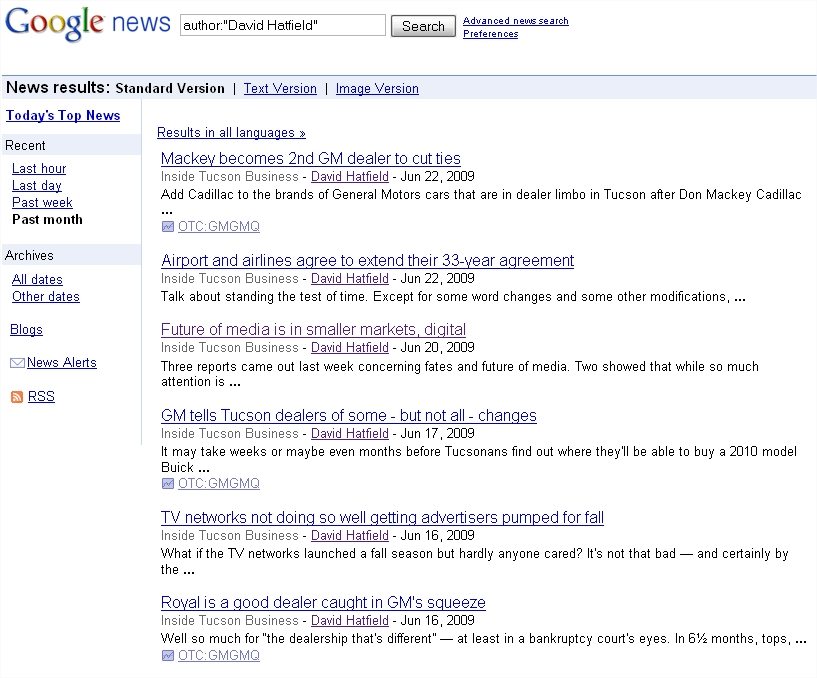 In the past, you could research byline history with Google, but now reporters are hyperlinked to each news hit, allowing you to point and click to follow a particular reporter’s published history. You can also type author:”INSERT REPORTER NAME HERE” into your Google News search window to find articles bylined by the same journalist.